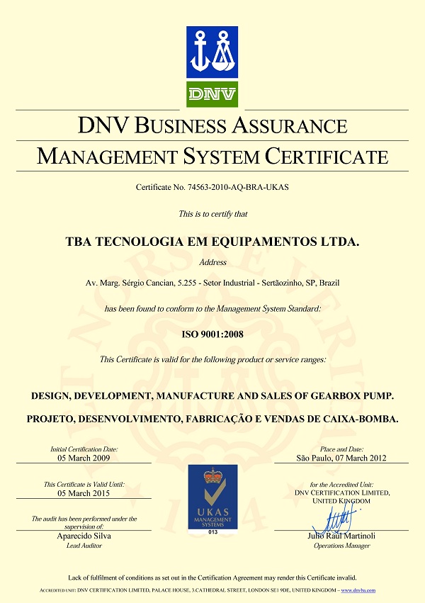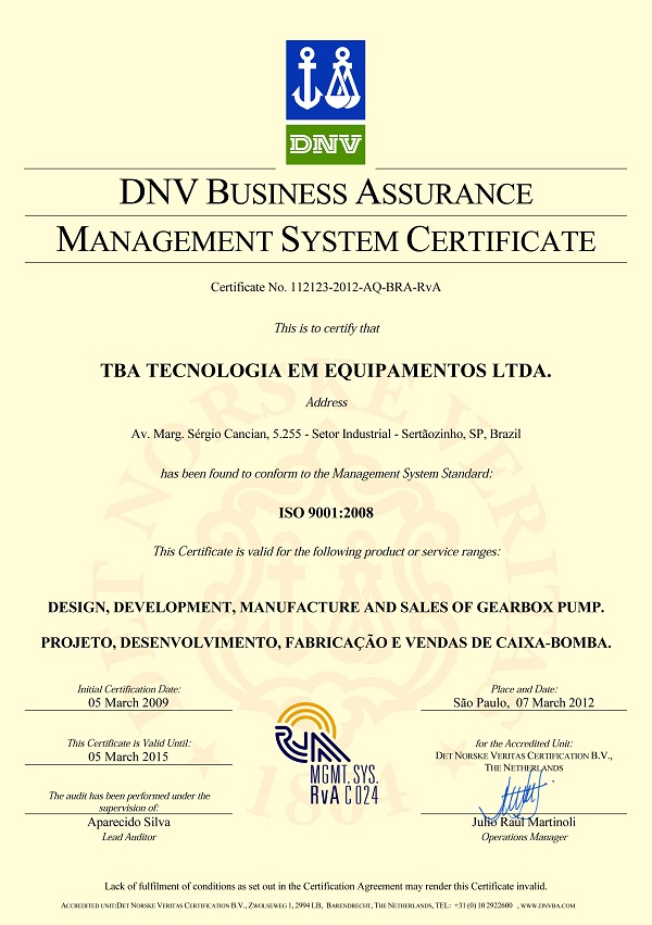 Denotando sua determinação em manter-se como pioneira e líder no seu segmento de mercado, através do nível de excelência como fornecedor, em março de 2009, a TBA já estava certificada pelo sistema ISO 9001, tendo como sua Política da Qualidade a que segue.